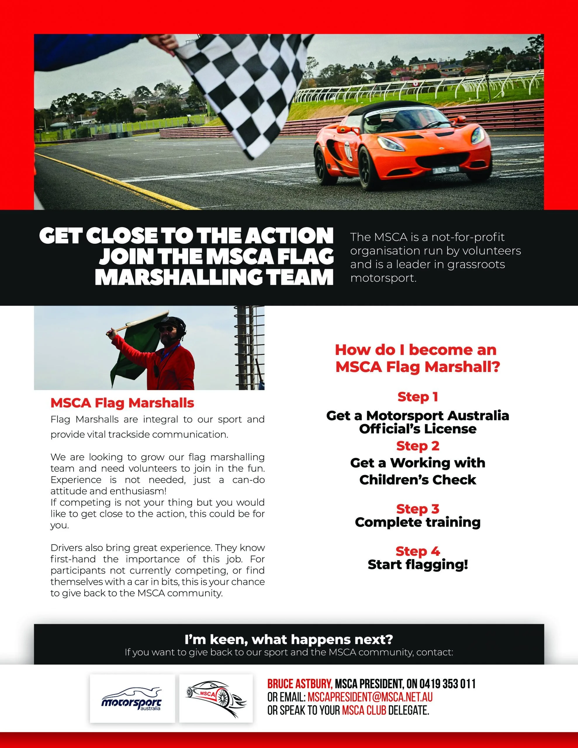 We are looking to grow our flag marshalling team and need volunteers to join in the fun. Experience is not needed, just a can-do attitude and enthusiasm!